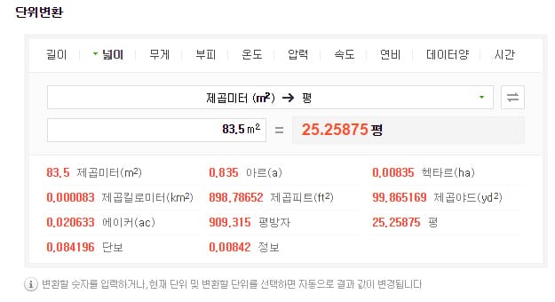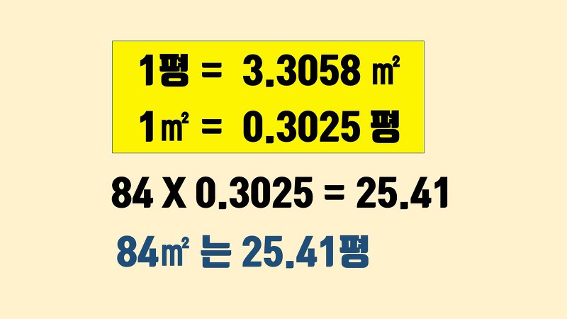 84㎡ ÷ 3.305785㎡ = 25.410000....평 입니다, 쉽게 계산해서 84㎡ ÷ 3.3㎡ = 24.45평으로 변환할 수 있습니다.